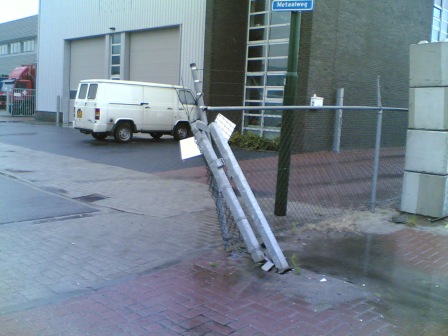 Rij ik in Brunsum op het indusrie plein waar ontzettend veel ruimte is, Raak met het wegdraaien uit een poort het hek. Leuk hoor dat heb ik nu weer.